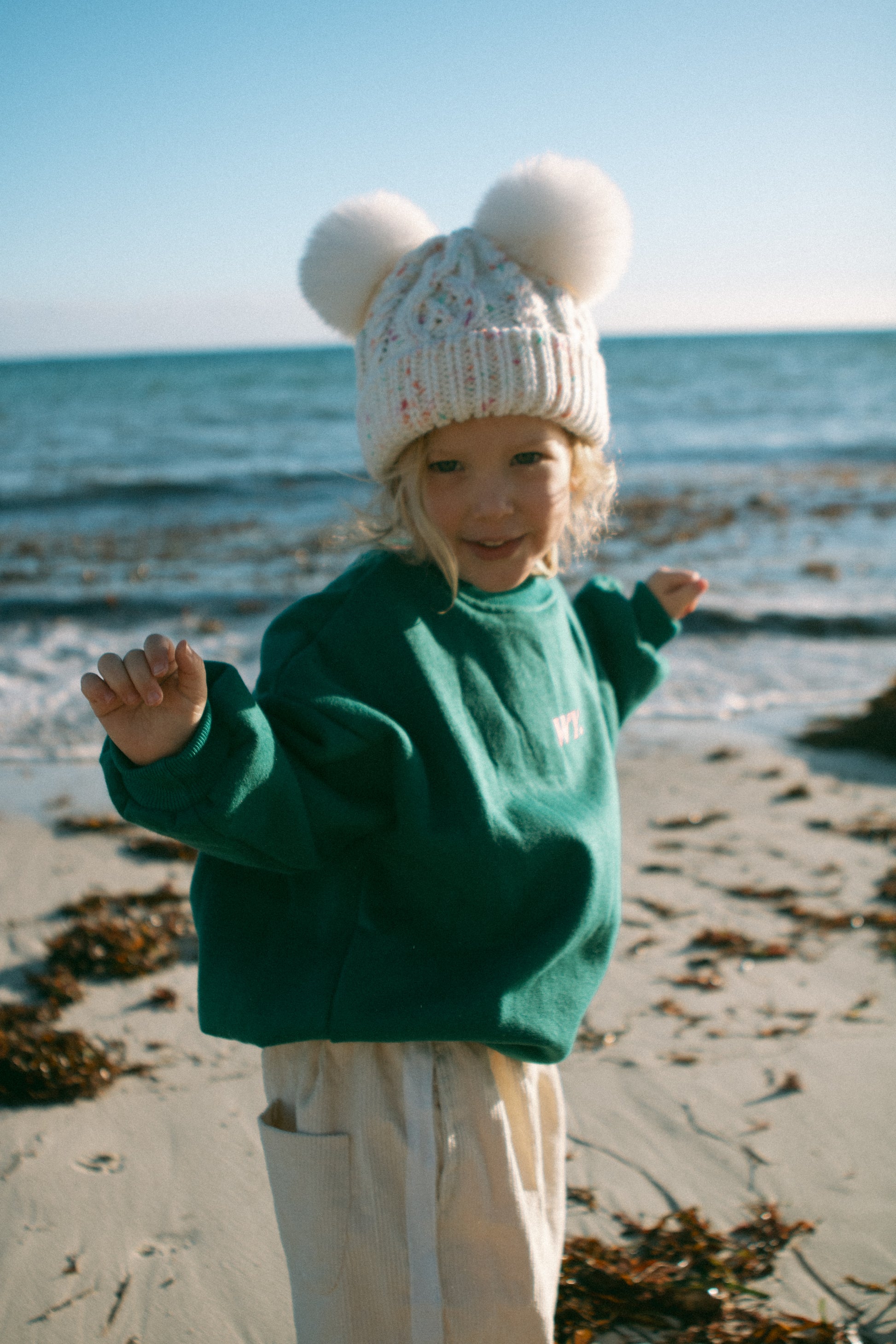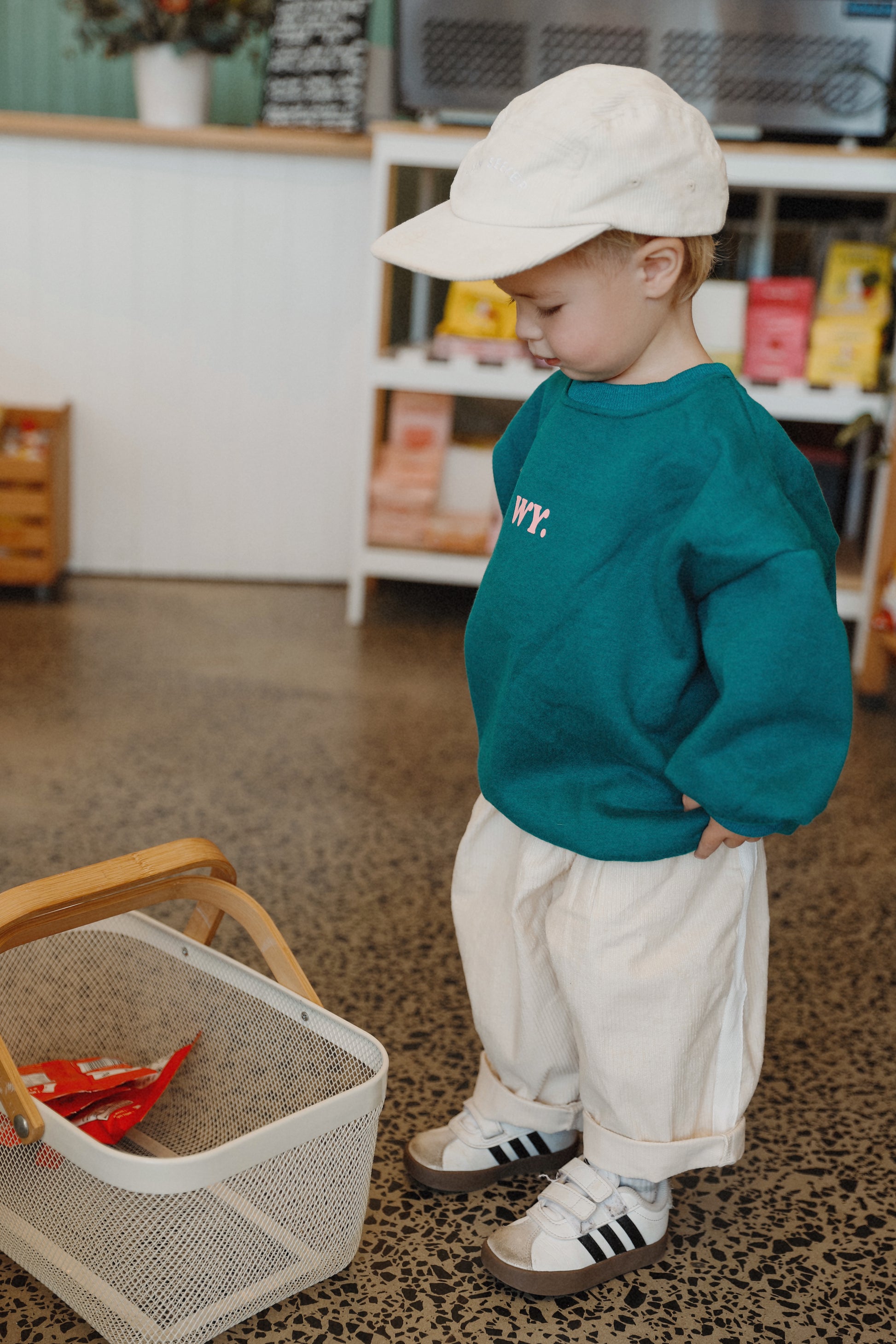 This toddler jumper features an oversized fit and a cozy fleece lining crew neck in a soothing midnight teal shade. Please note the logo print has imperfections, reflected in the reduced price. Despite this, the jumper offers soft comfort and easy layering, making it a practical and stylish choice for everyday wear.
